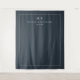 This elegant wedding backdrop features a minimalist design with a deep navy blue background, creating a sophisticated atmosphere. The layout includes clean lines and ample negative space, framed by a thin white border that adds structure. Customizable text elements are presented in bold serif fonts, allowing for personalization of names and dates. The overall style is modern and understated, perfect for formal occasions seeking a touch of refinement.
