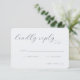 This elegant wedding RSVP card features a minimalist design with a clean, modern layout. The soft light gray background complements the deep navy blue script-style font that reads "kindly reply," creating a sophisticated and formal tone. Customizable fields allow guests to indicate their attendance status and number of attendees, while ample negative space ensures clarity and simplicity. Perfect for formal events, this card combines functionality with an uncluttered aesthetic, making it ideal for couples seeking a refined touch for their wedding invitations.