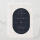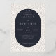 This elegant foil invitation features a sophisticated design with a navy blue oval centerpiece set against a white background adorned with subtle black polka dots. The layout is clean and organized, utilizing a classic serif font to convey the event details in a formal yet inviting tone. Perfect for weddings, this template offers customizable placeholders for names, dates, and locations, ensuring it can be tailored to any special occasion. The overall style exudes timeless charm, making it an ideal choice for couples seeking a refined and memorable invitation.