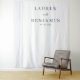 This elegant wedding backdrop features a minimalist design with a clean white background and subtle vertical lines on the left, adding texture without overwhelming the simplicity. The central text is arranged in a sophisticated serif font, creating a formal yet inviting atmosphere perfect for weddings or significant celebrations. With its dark navy blue colour palette, this design offers a timeless and professional look, ideal for capturing memorable moments. The overall mood is one of understated elegance, making it a versatile choice for any formal event.