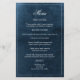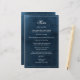Elegant and classy wedding design. Navy blue watercolor paper. White lettering. Elegant font combo. Wedding monogram: classic laurel wreath with bride’s and groom’s initials in it. Perfect for beach wedding, seaside wedding, coastal wedding, or ocean wedding. Blue and white colour theme, simple elegant design make it a great choice for a classy, semi-formal wedding.