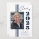 Class of 2025 elegant stylish graduation announcement with navy blue stripes, photo frame, and text on a white background.