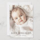 New baby thank you card featuring your photo and the baby's name and date of birth on the front. Custom message on the back. Dark brown text on white background.Change colours and fonts, move and resize elements in the design tool.