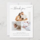 This elegant newborn birth announcement card features a simple, minimalist white background and grey calligraphy. The "thank you" header is in whimsical calligraphy script, and your custom text— baby´s name, and stats —is in classic typography. The card features a photo collage of three photos. The reverse features a full photo. Create your own birth announcement and baby shower thank you card by clicking on the ´´Personalise´´ button and replacing the templates with your own details and photographs. Perfect for a baby girl and a baby boy!