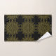 This elegant bath towel set features a repeating pattern of old gold mandalas on a black background.