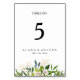 This elegant olive greenery table number is perfect for your modern summer boho wedding. It is designed with watercolor emerald green and sage-coloured leaves, touches of botanical gold, blush pink olive flowers, and simple black vintage typography. All these elements combine for a beautiful bohemian feel.
