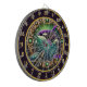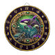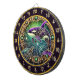 The entire composition is encased in a circular frame featuring intricate gold filigree, glowing gemstones, and celestial elements. This unique piece blends rustic charm with an imaginative flair, making it a perfect addition to any recreational space.