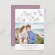 Elegant and romantic Save The Date photo card, featuring a beautiful and delicate dusty purple orchids floral line drawing on the upper part, over a white background. Easily personalizable by adding one of your favourite engagement horizontal pictures, and by editing the template fields on the lower band with your names, date, and location in a modern and simple purple all-caps font.