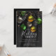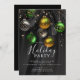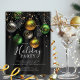 Modern elegance holiday party featuring a black background with green and gold Christmas ball ornaments.