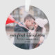 Stylish and modern personalized First Christmas ornament with elegant handwritten script lettering and transparent white texture texture. Personalize the product with the year, your names and two of your favorite photos.