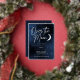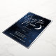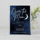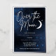 Elegant over the moon engagement party invitations in navy blue, white, and real silver foil. Celestial-themed party supplies with a moon and stars on a galaxy background to celebrate a couple about to have a wedding and get married.