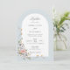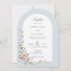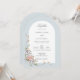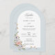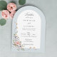 This romantic and elegant design features soft pastel roses and wildflowers in shades of blush pink, white, pale violet and gold on a light mint green background with white arch shaped centre. This design also includes flowing text graphics in a custom calligraphy font. The background colour is also customisable.