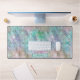This attractive desk mat features an elegant pastel blue, pink, and teal glittery gem abstract background. Your name or monogram is in dark teal at the centre of light teal banner at the bottom.