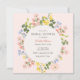 A delicate bridal shower invitation featuring soft pastel watercolor flowers in pink, yellow, and blue surrounding an elegant circular text layout on a light background. Perfect for celebrating a new marriage with a timeless and botanical touch.