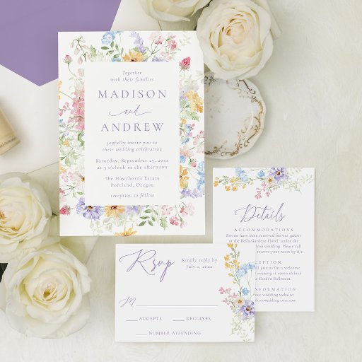Add a polished finishing touch to your wedding invitations with this elegant pastel wildflower return address label featuring delicate watercolor wildflowers in soft shades of purple, pink, yellow, blue, and white with light greenery. The floral accent sits along the side of the label while lavender purple lettering displays your names and return address in a clean and refined layout. Perfect for spring and summer weddings, garden ceremonies, and romantic outdoor weddings, this wildflower return address label coordinates beautifully with the matching invitation suite and adds a charming floral detail to your envelopes.
