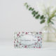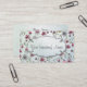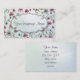 Beautiful business card design with a delicate flower pattern with pink flowers on a light blue background.