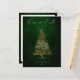Elegant, striking and timeless holiday design featuring pine tree in gold gradient embossed style with "Peace on Earth" custom gold calligraphy script on glowing deep green artisan background with two lines of editable text. Back features complementary graphics and additional text fields. All graphic elements are editable.