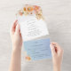 Elegant All- in- One tri- fold wedding invitation with perforated RSVP postcard. Design with delicate watercolor floral cascading down showcasing your wedding details in a beautiful blend of flowers peach, orange, dusty coral, blush, cream and champagne hues. RSVP in attractive watercolor wash background in blue tones. Modern hand written calligraphy elements. Environmentally friendly, as there is no need for extra insert cards, RSVP cards or even envelopes, this invitation has it all! Ability to add both Wedding Ceremony and Reception details, as well as RSVP postcard ready for guests to fill in and mail! Ability to add or erase RSVP meal options. Option to order invitations with printed (or hand write later) guest name on the back so you can mail card with no need of any envelope, - OR - if you prefer to use an envelope, simply erase guest name and address characters from text boxes to remove, or add a quote instead. Outside with beautiful blue bottom watercolor and flap with exquisite floral monogram with couples initials. Attractive design for the elegant, yet practical and eco-friendly couple! Part of our "Peach Floral Delight with Blue" collection with a variety of coordinating products available. Visit the entire extent of this collection at: https://www.zazzle.com/collections/peach_floral_delight_with_blue-119436951689312574