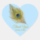 Elegant peacock feather golden Thank You on light blue Heart Sticker. Text ready to be personalised.