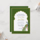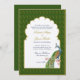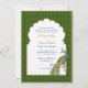 Elegant watercolor peacock in a golden arch with a gold and rich dark green paisley background wedding Invitation. Perfect for Indian wedding.