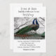 Capture the essence of elegance and natural beauty with this stunning wedding invitation featuring a pair of majestic peacocks perched gracefully on a rooftop. The vibrant plumage and intricate feather patterns create a breathtaking display. The background features bare tree branches against a cloudy sky.
