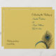 Elegant peacock feathers accent this wedding program on a pale saffron yellow background. It is printed on the lightweight paper, so it is easy to fold in half.