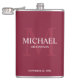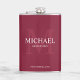 This flask features personalised groomsman's name with title and wedding date in white and monogram in light burgundy red as background, in classic serif font style, on burgundy red background.