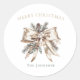 Add a luxurious finishing touch to your holiday gifts with this elegant personalized Christmas sticker featuring a satin champagne bow, pine greenery, holly leaves, and soft winter accents. The neutral palette pairs beautifully with any wrapping style—from classic gold to modern minimal. Perfect for sealing envelopes, decorating packages, or adding a custom touch to Christmas cards and party favors. Personalize with your family name for a timeless, sophisticated holiday detail.