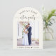 Elegant arch-shaped cream elopement or private wedding announcement and reception invitation featuring your wedding day photo, "Happily Ever After Party" in a mix of simple typography and a stylish script with swashes, your first names and wedding or reception date joined together with a heart. On the back, personalise your announcement and invitation and add your names in a signature-like script.