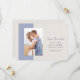 Wedding save the dates in a blue and beige faux linen paper design, perfect for a beach or coastal wedding. Customise with your photo and wedding details, mail to family and friends asking them to reserve your wedding date.