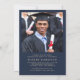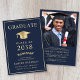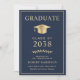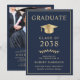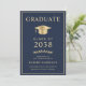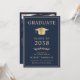 Elegant blue college graduation announcement and party invitation that features a gold grad cap and the graduate's name, class year, college or university, degree and major or honours in classic typography. On the back, add a photo and the graduation party details.
