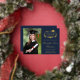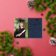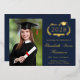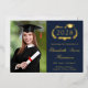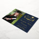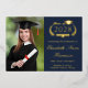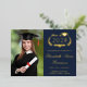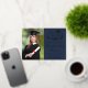 Modern dark blue college graduation announcement featuring real foil, "Class of" in an illustration of laurel wreath incorporating a grad cap topper and diploma, a photo of the graduate and their name in an elegant script. Add their school, major, honors or future plans.