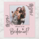 Modern, trendy Bridesmaid proposal wine bottle labels. Design features single photo inside arch frame with floral elements on a blush pink and white background, typography script '' will you be my Bridesmaid''.