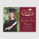Modern burgundy red college graduation magnetic card announcement featuring "Class of" within a laurel wreath, a grad cap and a diploma, a photo of the graduate and their name in an elegant light gold script. Add their school, major, honours or future plans in modern light gold typography.