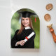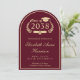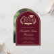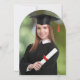 Classic arch-shaped burgundy red formal college graduation announcement featuring "Class of" within a gold illustration of a laurel wreath incorporating a grad cap and diploma, and the graduate's name in an elegant light gold script. Add their school, major, honours or future plans in simple gold typography. The grad's photo fills the back of the card.