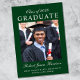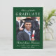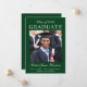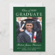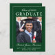 Simple formal green college graduation announcement featuring the graduate's photo, his or her name and class year in an elegant white script and his or her university, major and honours in modern white typography.