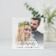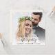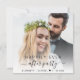 Elegant light cream elopement or small wedding announcement and reception square invitation featuring your wedding day photo and "Happily Ever After Party" in a mix of simple typography and a chic script with swashes, your first names joined by a heart and your wedding or reception date. On the back, personalise your message and add your names in a signature-like script.