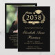 Elegant black college graduation party invitation featuring the graduate's class year in a laurel wreath crest with a grad cap topper and diploma, their name in a formal script, and their school, major, honours or future plans in classic serif typography. On the back, add a photo and the graduation party details.