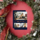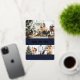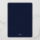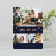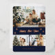 Elegant navy blue and rose gold Happy New Year card featuring a photo collage with rose gold foil paw prints and text on the front and a plaid blue background at the back.