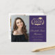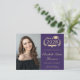 Formal purple college graduation announcement postcard featuring the grad's class year, an illustration of laurel wreath, a grad cap topper, a diploma, a photo of the graduate and their name in an elegant gold script. Add their school, major, honours or future plans. On the back, add an additional photo and your personalised message.