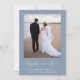 Elegant dusty blue elopement or small wedding announcement and post-wedding reception invitation. The front features your photo, "happily ever after" in a stylish white script with swashes and your names, wedding date and location. On the reverse, personalise your wedding announcement, add a reception or party invitation, input your wedding website address to create a QR code for guests to scan to RSVP online and sign your married names in a signature-like white script.
