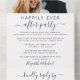 Elegant elopement or private wedding announcement combined with a wedding reception invitation to announce your marriage to family and friends and to invite them now to a post-wedding reception or party. This design features your photo and customised marriage announcement and reception invitation, "Happily Ever After Party" in a mix of simple typography and a stylish script with swashes. Input your wedding website URL address to create a QR code for your guests to RSVP online and obtain information on accommodations, directions, any night before parties and other details. A tear away RSVP postcard provides a convenient and eco-friendly and envelope-free response from your guests.