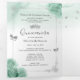Planning a silver and seafoam green quinceañera or sweet 16 birthday party and searching for elegant trifold invitations ideas to match your ballgown dress? This beautiful, DIY template is easily personalised with custom details and photos (three). The light green floral art by Raphaela Wilson features soft watercolor roses with pretty faux metallic silver greenery leaves, a princess tiara / queen crown, faux diamond sparkle glitter butterfly confetti, fancy scroll filigree borders, and other luxurious royal elements. Feel free to move around any of the artwork, change the background colours, and even alter the script calligraphy and modern fonts to a style that suits your design best. The layout of the text is designed with traditional Mexican invitation wording in mind, which helps to switch the English to Spanish if needed. These unique botanical light seafoam green and silver elegant trifold quinceanera invitations contain plenty of program room to include 3 photos (glam XV Mis Quince Anos pictures) or more depending on how you customise the card. If you're celebrating a mint wedding, once upon a time bridal shower, or fairy tale princess baby shower instead, simply personalise the wording on these seafoam green quince invites to fit your plans! Category: watercolor tri fold quinceanera invitations template with photos; light seafoam green quinceañera birthday invitations with flowers / butterflies. Silver and light green quince theme colours: sea foam green, light turquoise teal, pastel green, pale blue green mint, light grey, dark grey, silver and white.