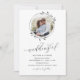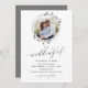 This elegant photo wedding invitation features your picture at the top surrounded by a simple charcoal grey wreath. It's paired with a romantic calligraphy script.