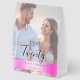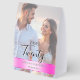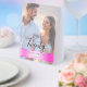 The table number, set in graceful calligraphy across the lower portion, adds a sophisticated yet understated flourish. On the beautiful hot pink band that spans the lower third, your names and special date appear in polished white lettering—offering a stylish contrast that feels both timeless and beautifully curated.