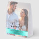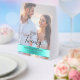 The table number, set in graceful calligraphy across the lower portion, adds a sophisticated yet understated flourish. On the elegant turquoise band that spans the lower third, your names and special date appear in polished black lettering—offering a stylish contrast that feels both timeless and beautifully curated.
