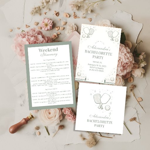 Celebrate the bride-to-be with a chic pickleball-inspired bachelorette party design featuring soft green tones, elegant laurel details, and classic preppy charm. This fresh, modern layout blends sporty fun with elevated garden style, making it perfect for a stylish weekend getaway or destination celebration. Ideal for pickleball lovers who want something playful yet refined, this design sets the tone for a memorable and polished bachelorette party.