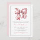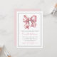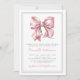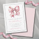 A cute and girly pink bow baby shower theme featuring an adorable baby or blush pink watercolor bow. The front includes handwritten script calligraphy lines in a soft pink colour to match the bow, paired with a double thin grey frame for an elegant and traditional touch. The back features a rose pink colour that complements the bow on the front.