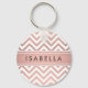 Accessorize your keys in style with a chic modern round keychain. Design features a pretty pink faux rose gold foil chevron zig-zag pattern and stripe, and your name or other customized text in a simple dark grey typography font. This elegant and trendy accessory makes a stylish gift for her. Perfect as a bridal shower or bachelorette party favor, or as a bridesmaid gift idea.