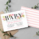This modern horizontal baby shower invitation showcases the bold title word "Baby" crowned with lush watercolor blush, pastel pink, and peach dahlia and rose blooms with spring green foliage. Pink calligraphy script highlights the honoree's name for a soft and feminine look. The striped pink and white backing adds a playful coordinating detail. All text is fully editable to personalise for your celebration.